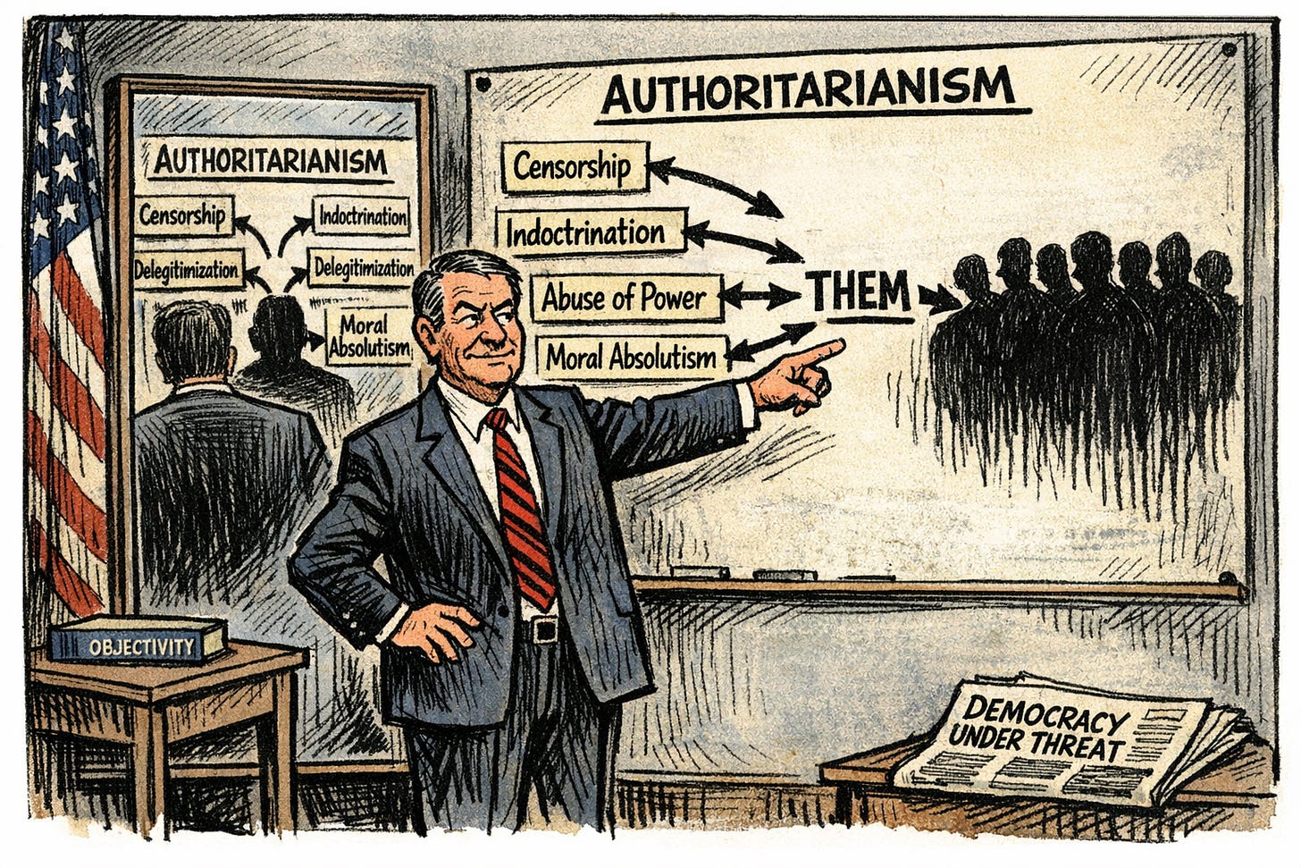 One of the more misleading assumptions in contemporary political debate is that authoritarian movements persist because their supporters fail to recognize authoritarian behavior. The evidence suggests something more complicated, and more unsettling. Authoritarian-aligned voters are often quite capable of identifying authoritarian structures when those structures are perceived to exist elsewhere. They can name censorship, indoctrination, delegitimization, and persecution with real fluency. What they struggle to do is apply those same recognitions inward, to their own group, leaders, or actions. This is not a deficit of awareness. It is a failure of self-application.